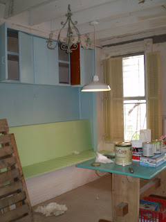 Meanwhile, down in the kitchen area Elaine Fuller was painting. The bench and table are almost ready for use. I will celebrate the first time we eat on the table. We couldn't today because the paint on the bench was still wet.
